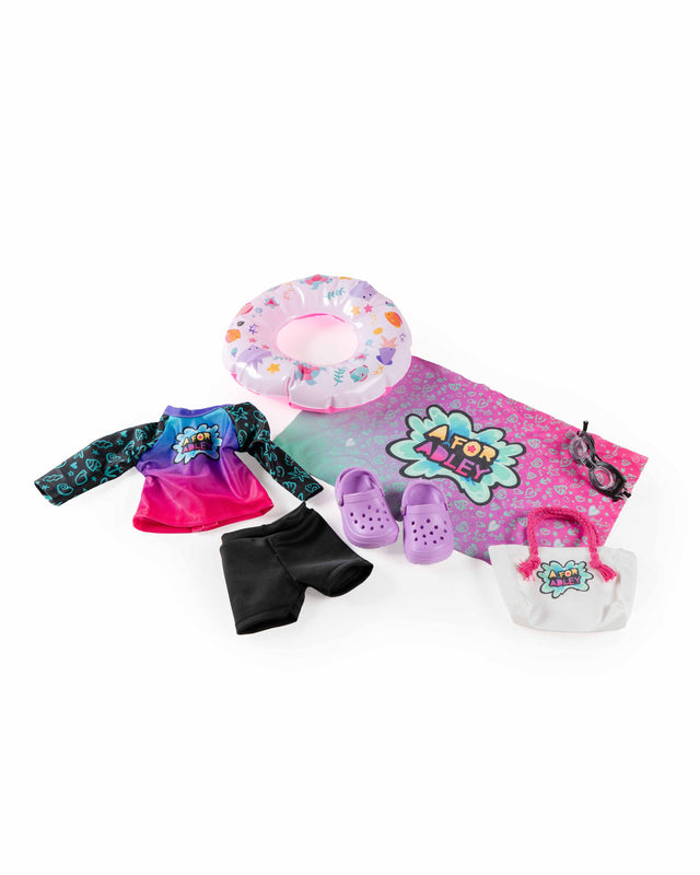 This playful set features matching swim outfits and accessories for your doll, including a donut floatie, tote, swim shoes, goggles, and two rash guards with shorts.